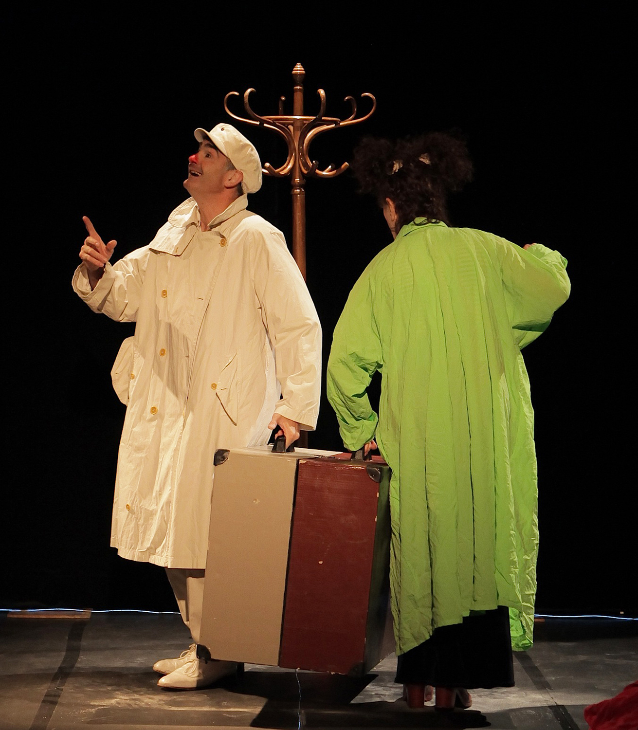 Ce spectacle de danse-théâtre évolue sans un mot, dans une ambiance sonore rythmée par le temps qui passe… les bruits des vêtements animés… les sons, les respirations et les gromolos des deux personnages. Un univers empreint de tendresse, de gestes quotidiens, de clowneries, d’humour et de poésie, donnant vie et liberté aux accessoires qui entrainent les deux personnages l’un vers l’autre.